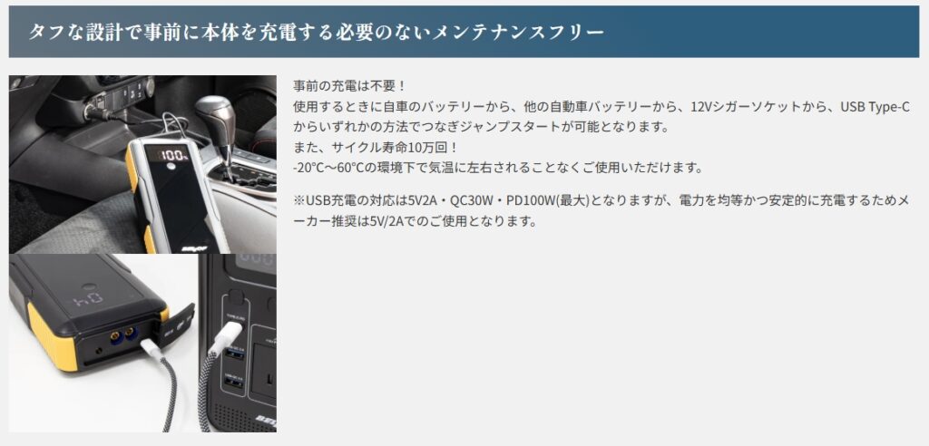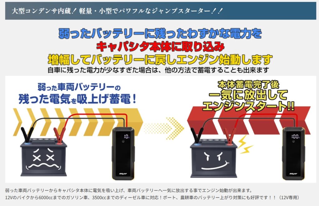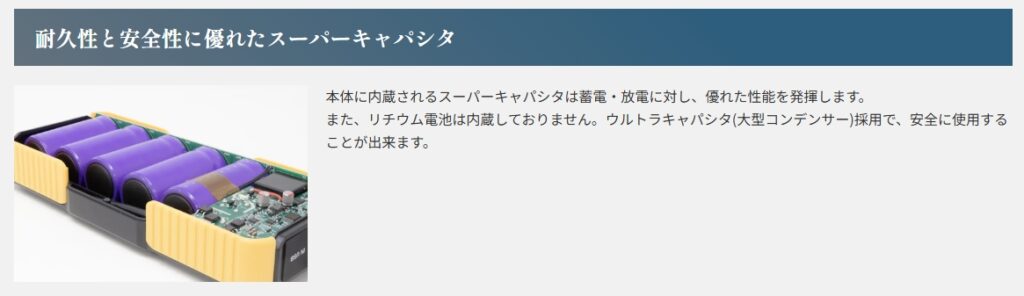 このキャパシタに蓄電し、それを一気に放電することで確実にジャンプスタートできるそうです!