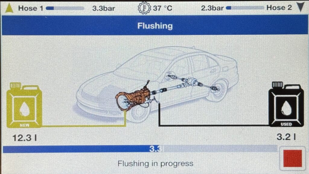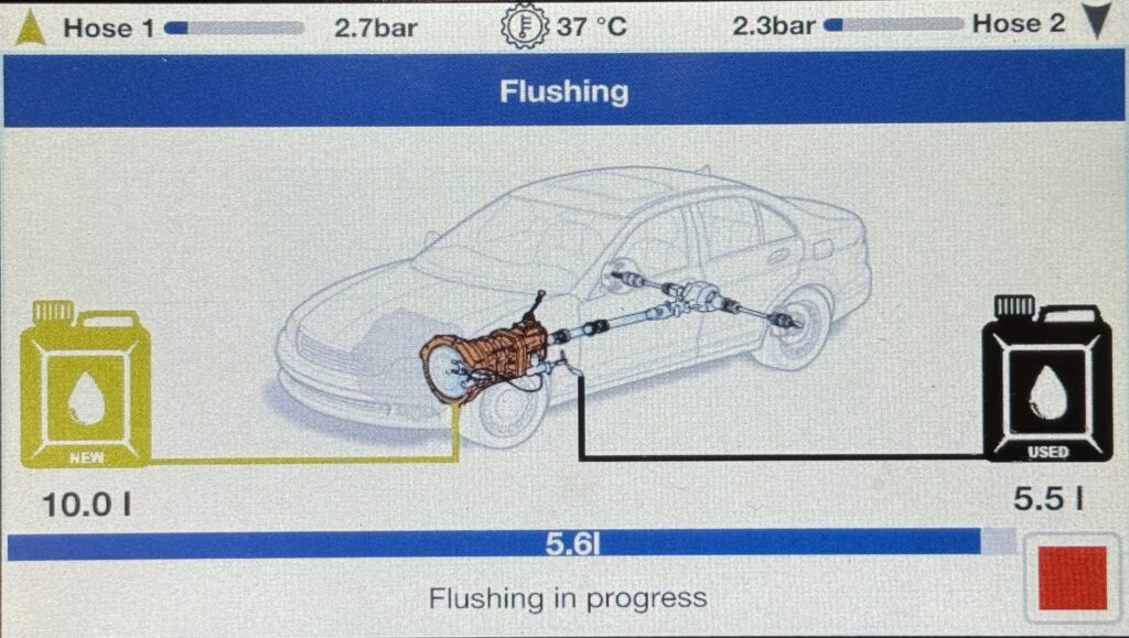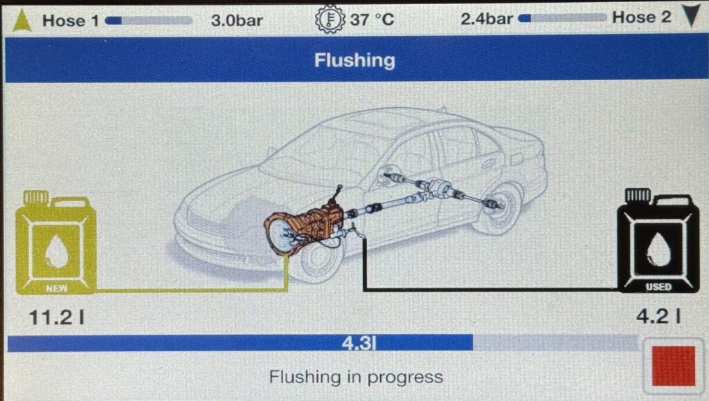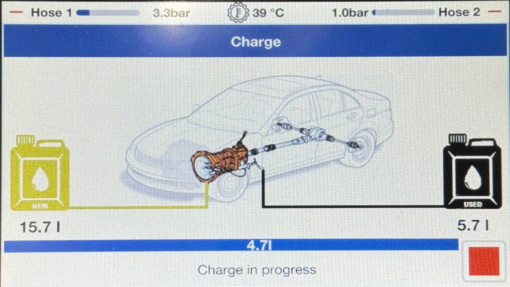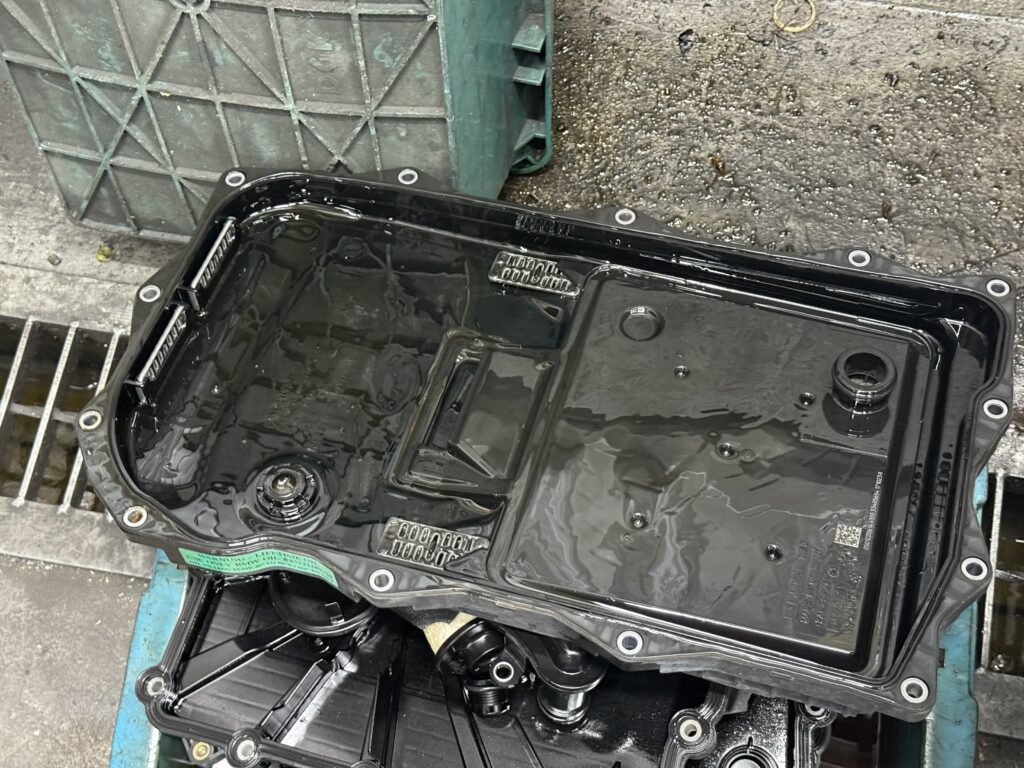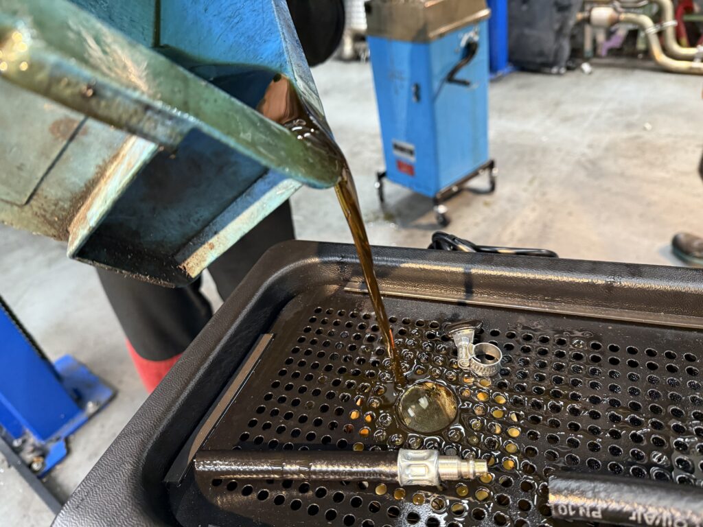 新しいオイルパンを付けて、交換時に吸引と出てきた分をフラッシングする前にGT3が新油を注入します。