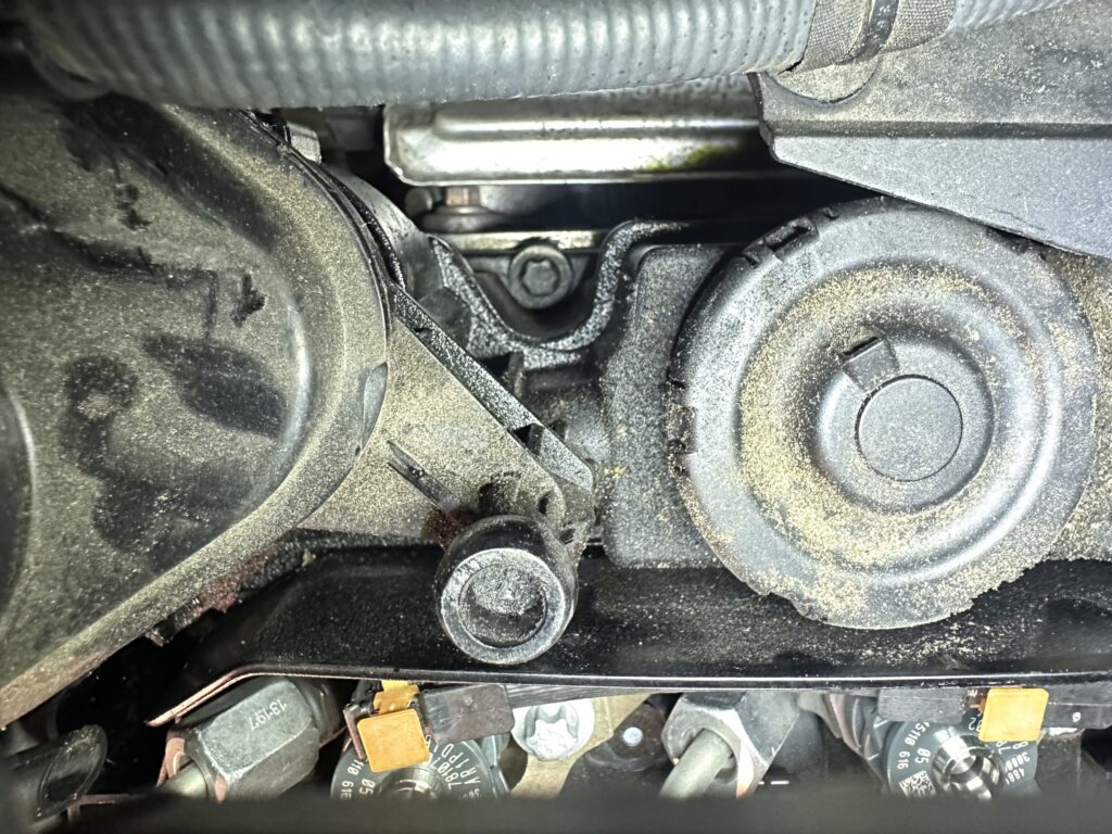 漏れ具合はこんな感じで更に酷くなるとDPFあたりにオイルが落ちて焦げ臭いにおいが室内に入ってくるように。