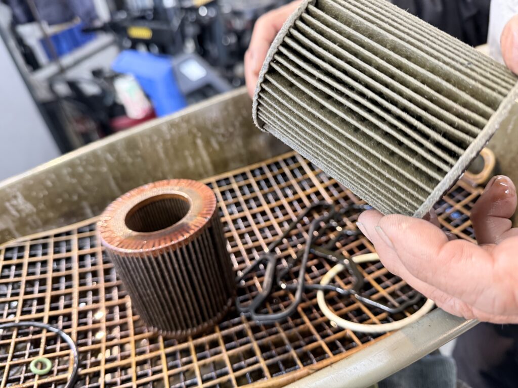 エンジンオイルフィルターもご覧の通り奥に見えるのが通常な状態、手前が今回のH様のフィルター。。。