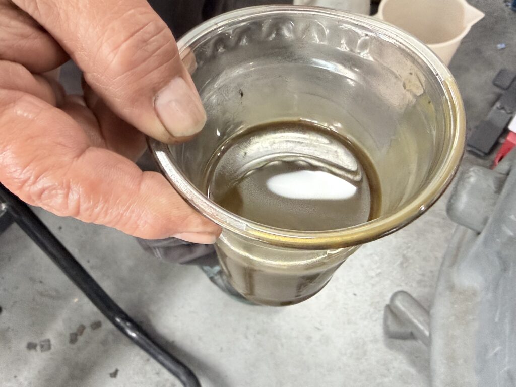 変色したエンジンオイルと同じような色で臭いも燃料臭いです。